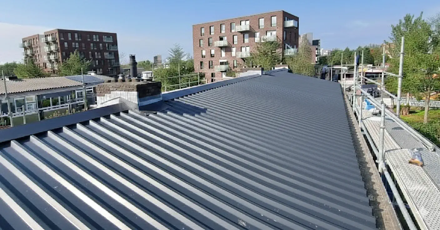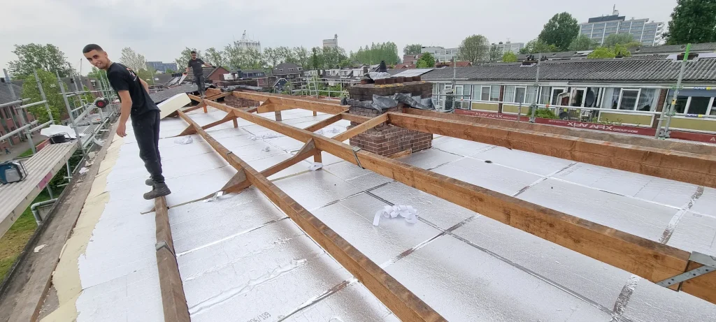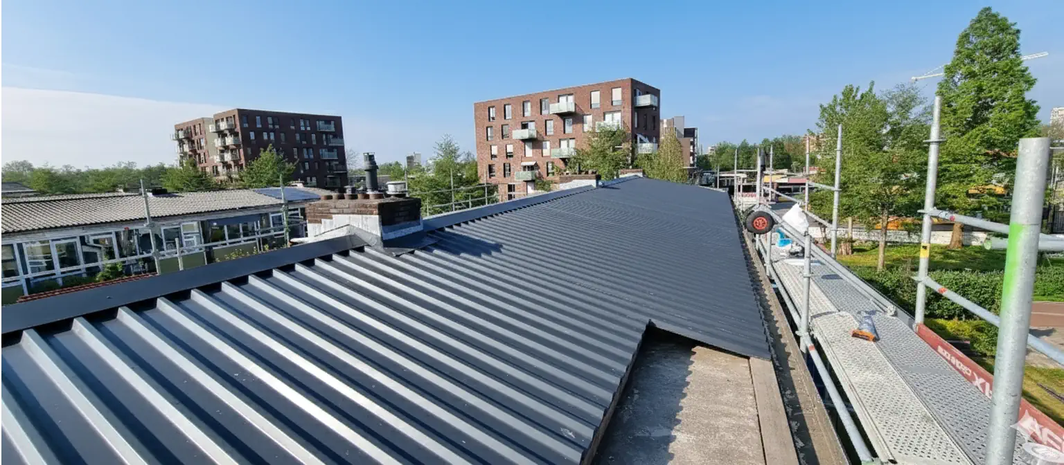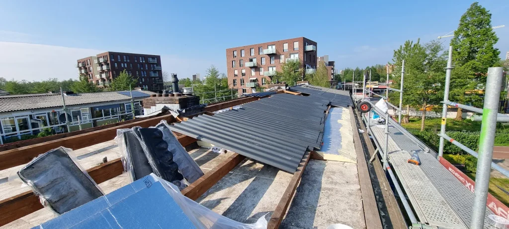 Bij dit project in Nieuwegein hebben wij het bestaande dak volledig vernieuwd en voorzien van een nieuwe geïsoleerde dakopbouw. De oude dakbedekking is verwijderd, waarna de draagconstructie is gecontroleerd en waar nodig hersteld. Vervolgens is het dak opnieuw opgebouwd met isolatiemateriaal en afgewerkt met duurzame stalen dakplaten.